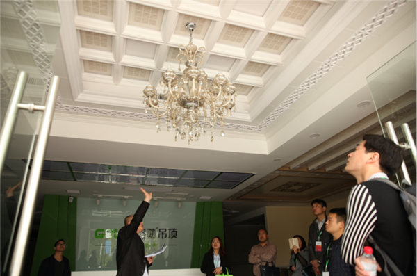 招商會當天行程安排得相當緊湊,意向客戶一行人在公司招商人員陪同下上午先是參觀成品倉庫、公司生產(chǎn)流水線、公司辦公區(qū)域,接著是公司的680平米新展廳。該展廳是格勒公司自2014年下半年開始著手實施的一個大項目,主要用于格勒公司展示全屋吊頂出樣,來的早不如來得巧,該展廳是第一次對外開放,雖沒有完全竣工,仍難掩大空間、大格局的氣度。